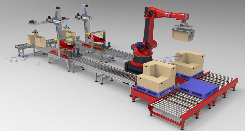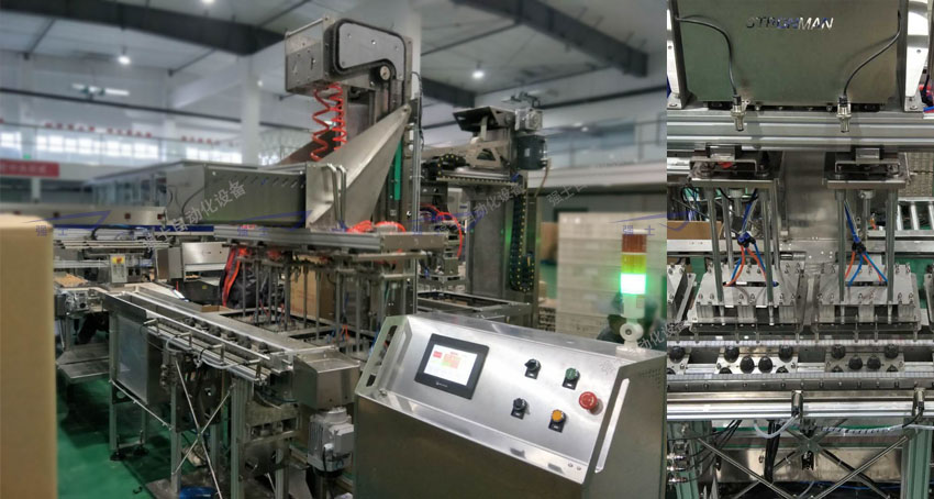 本生產(chǎn)線包含紙箱成型、自動裝箱、封箱、打包、機器人碼垛、自動托盤庫等設(shè)備。適合于各種大、中型包裝生產(chǎn)線。適用于各種包裝容器,可包裝塑料扁瓶、圓瓶、不規(guī)則形瓶、各種大小玻璃瓶,圓瓶、橢圓形瓶、方形罐及紙罐等。裝箱機采用P.L.C+觸摸顯示屏控制。設(shè)有缺瓶不裝箱,無瓶不裝箱等安全裝置,穩(wěn)定的伺服裝置,使設(shè)備在運行中更加高率。碼垛機將產(chǎn)品按一定排列碼放在托盤上,進(jìn)行自動堆碼。本流水線大大方便操作、管理、減少生產(chǎn)人員和勞動強度,是自動化規(guī)模生產(chǎn)必不可少的設(shè)備。